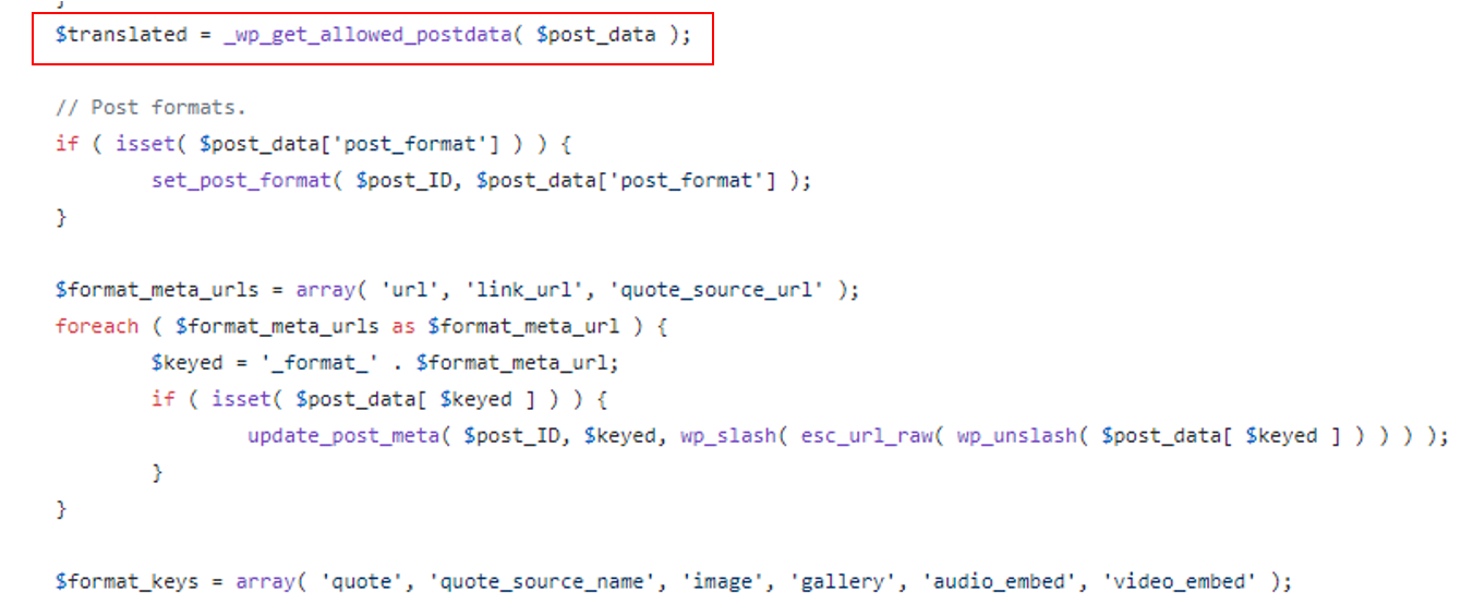 현재 워드 프레스 깃허브에서 확인해본 결과 post data에 대해서 _wp_get_allowed_postdata() 라는 필터링 함수가 추가되었습니다.