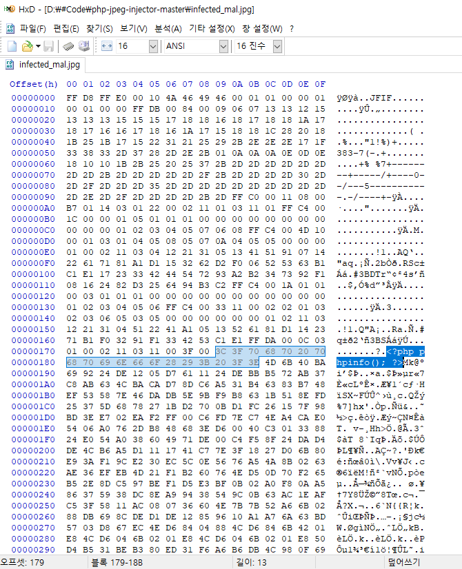 위와 같이 매직넘버에 php코드가 삽입된 악성 이미지인 infected_mal.jpg를 만들었습니다.