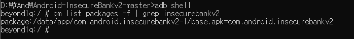 pm list packages -f | grep insecurebank2 --> 깔린 패키지 중 grep 으로 필터링