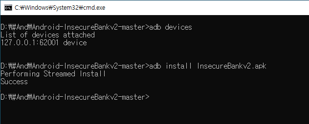 adb devices 로 장치를 찾고, 해당 장치에 InsecureBank2라는 애플리케이션을 설치하는 명령어를 입력했습니다.