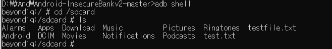 쉘로 들어가 /sdcard 를 살펴보면 test.txt 파일이 성공적으로 push 된 것을 확인할 수 있습니다.