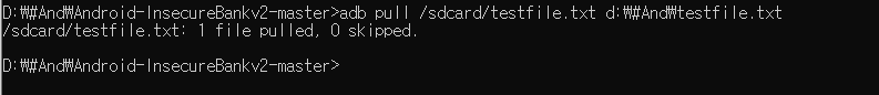 먼저 안드로이드 장치 속 특정 디렉터리에 테스트용 파일(testfile.txt)를 만들어 놓고, pull 명령어를 이용해