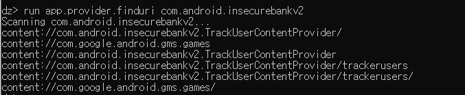지금까지 콘텐츠 프로바이더 정보 분석 -> URI 정보 획득 -> 쿼리문 생성하여 sql injection 공격 가능 확인