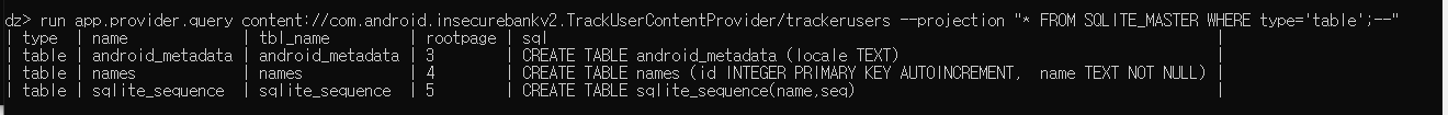 명령어 : < run app.provider.query [URI] --projection "* FROM SQLITE_MASTER WHERE type='table';--" >