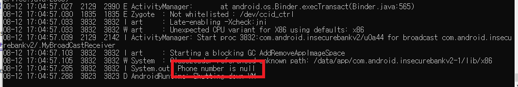 해당 브로드캐스트를 보내는 순간, 안드로이드 로그에 Phone number is null이라는 문자열이 출력됩니다.