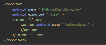 위 코드에서 브로드캐스트의 이름은 theBroadcast 이며, 해당 브로드캐스트 신호를 받으면 MyBroadCastReceiver에 설정된 작업을 수행하게 되어있습니다.