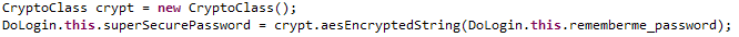 그 다음 비밀번호를 복호화 해야되는데, 다음 코드를 보면 CryptoClass()에서 객체를 생성해서 거기에 있는 aesEncryptedString 메서드를 사용하는 것을 볼 수 있습니다.