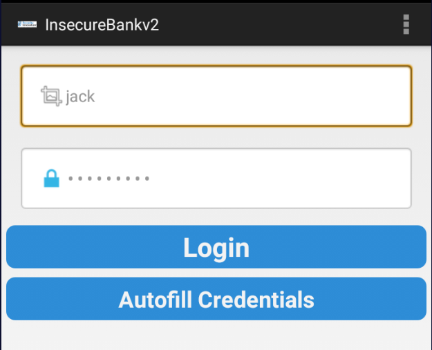 인시큐어뱅크 앱의 로그인 화면입니다. Login 버튼 밑의 Autofill Credentials 를 누르면 직전에 로그인했던 ID와 password를 불러와서 자동으로 입력해줍니다.