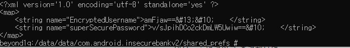 위 사진과 같이 mySharedPreferences.xml 와 com.android.insecurebankv2_preferences.xml 파일이 존재합니다. 해당 파일을 cat 명령어로 출력해보면,