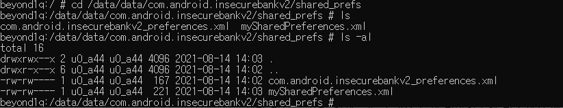 < cd /data/data/com.android.insecurebankv2/shared_prefs >