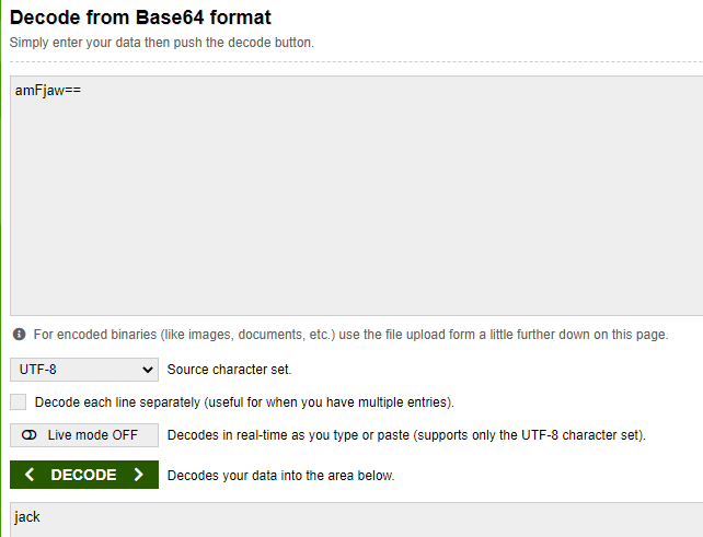 username은 Base64로 인코딩 되어있기 때문에 온라인 사이트에서 바로 해독이 가능합니다.
