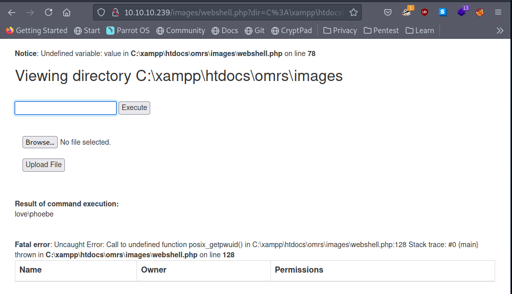 그럼 이제 http://10.10.10.239/images/webshell.php 를 요청하면. 아래와 같이 웹쉘이 실행되어, user 권한의 쉘이 따졌습니다!