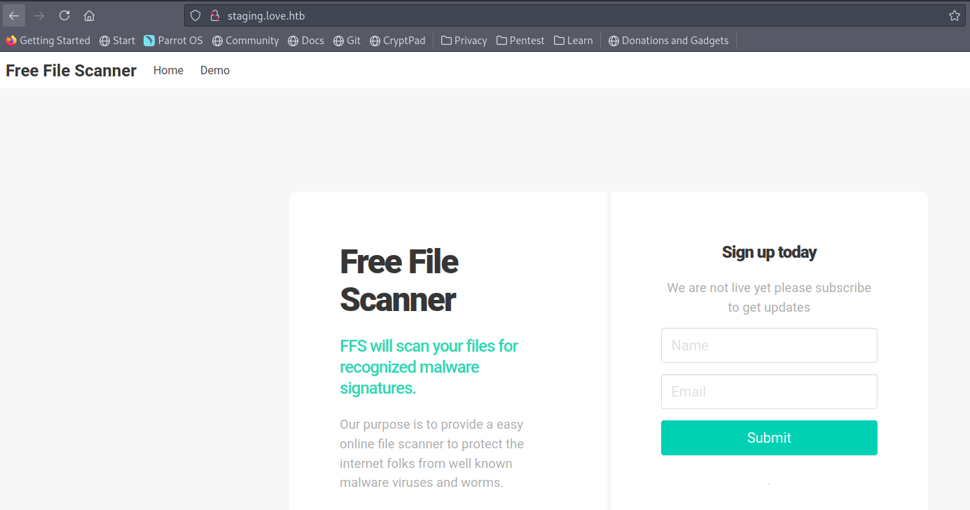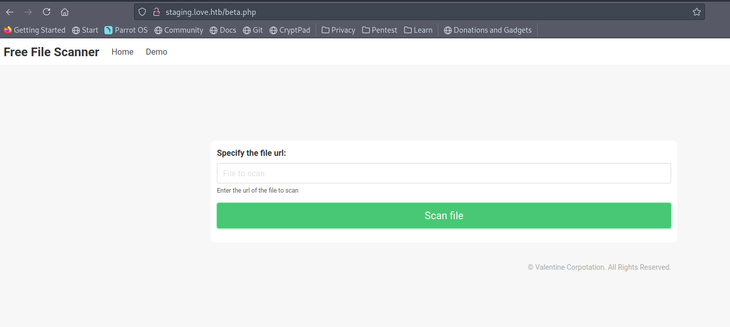 이제 브라우저에 http://staging.love.htb 를 치면? -> 10.10.10.239 에 있는 서브도메인을 접속할 것입니다.