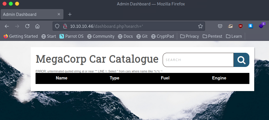 이제 admin / qwerty789라는 계정정보를 가지고 10.10.10.46:80 웹서버로 접속해 로그인을 하면, 뭔가 데이터를 출력해주는 화면이 나옵니다. 아래 사진과 같이 search 파라미터에서 sql injection 취약점이 터지는 것을 확인했습니다