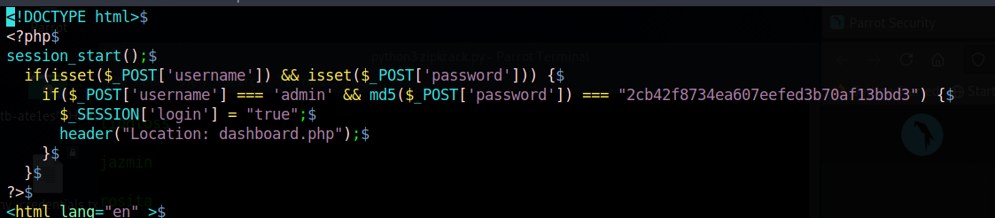압축파일 안에 index.php 가 있었고, 그 안에 admin의 비밀번호가 코딩되어있습니다.[md5로 암호화 된 상태]