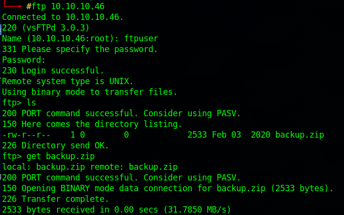 해당 계정정보로 FTP에 접속하여 파일을 검색해보니, Backup.zip 파일이 존재했고, get 명령어로 내 서버로 받아왔습니다.
