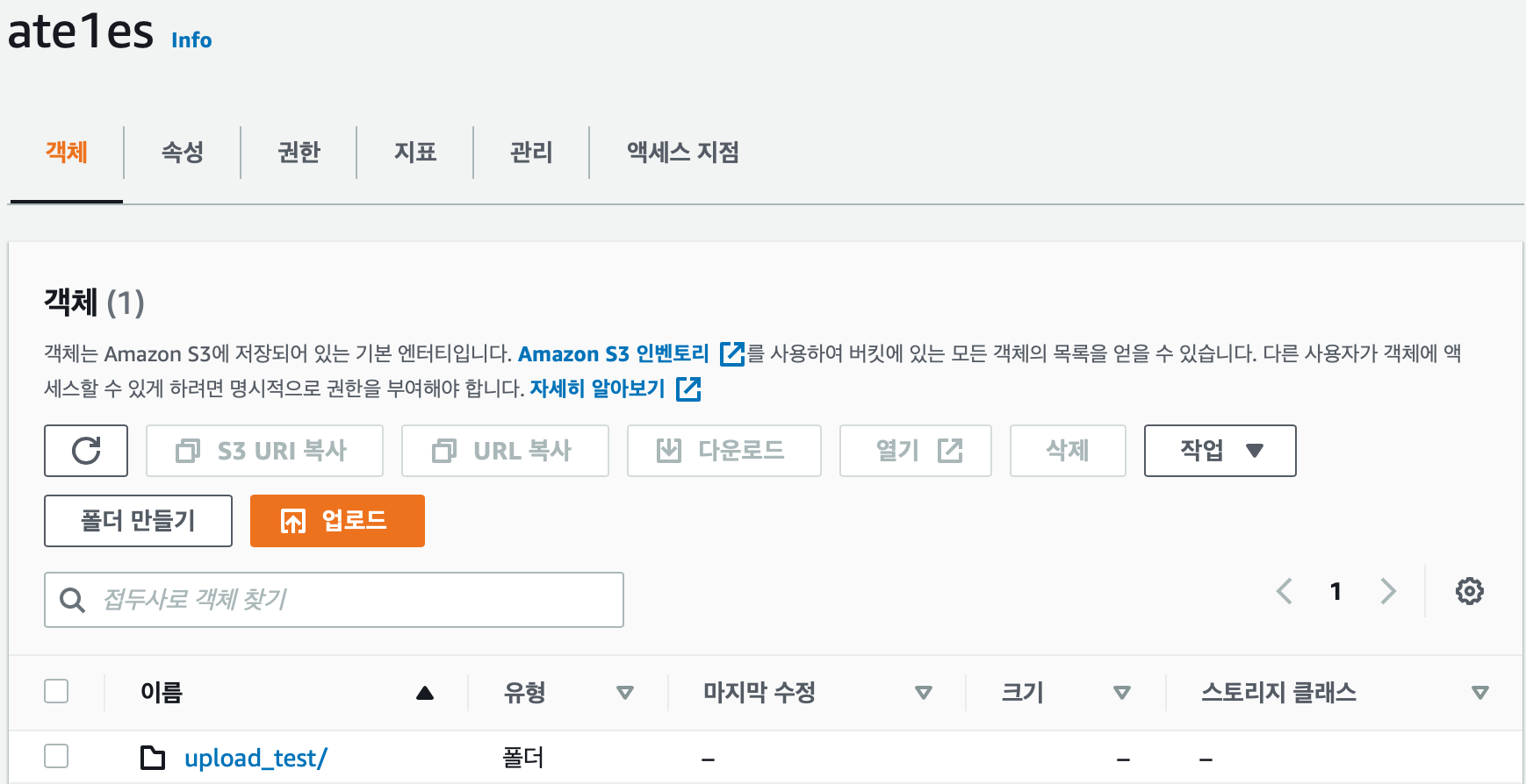 생성된 버킷으로 들어와 [폴더 만들기]를 통해 테스트 폴더를 생성했다.