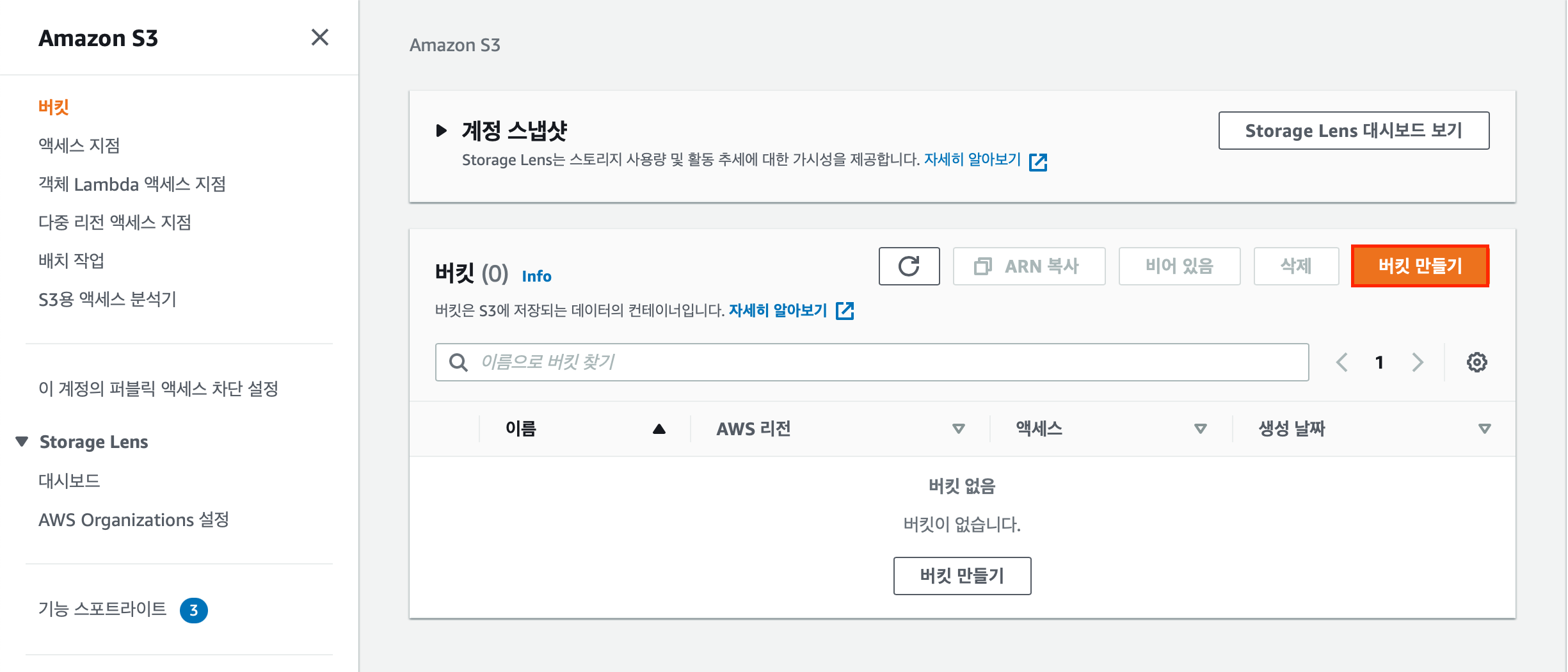 [서비스] - [스토리지] - [S3] 을 클릭하여 들어오면, 아래 화면이 나타납니다. S3 서비스 사용을 위한 버킷을 생성해야함