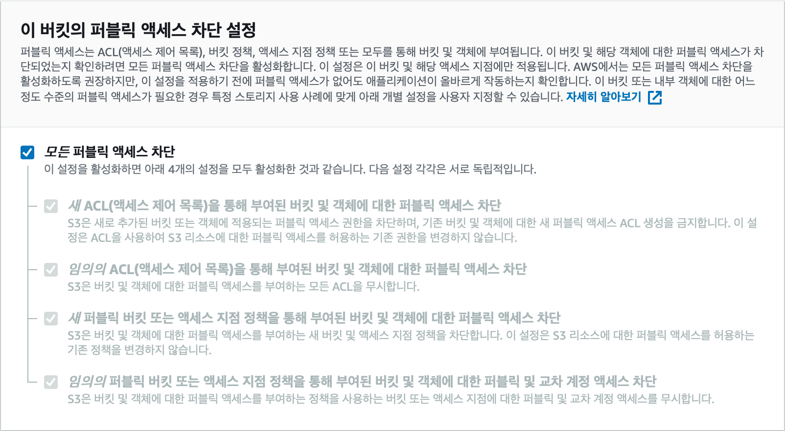 [현재 설정으로 인해 이 버킷과 그 안에 포함된 객체가 퍼블릭 상태가 될 수 있음을 알고 있습니다.] 에 체크 후