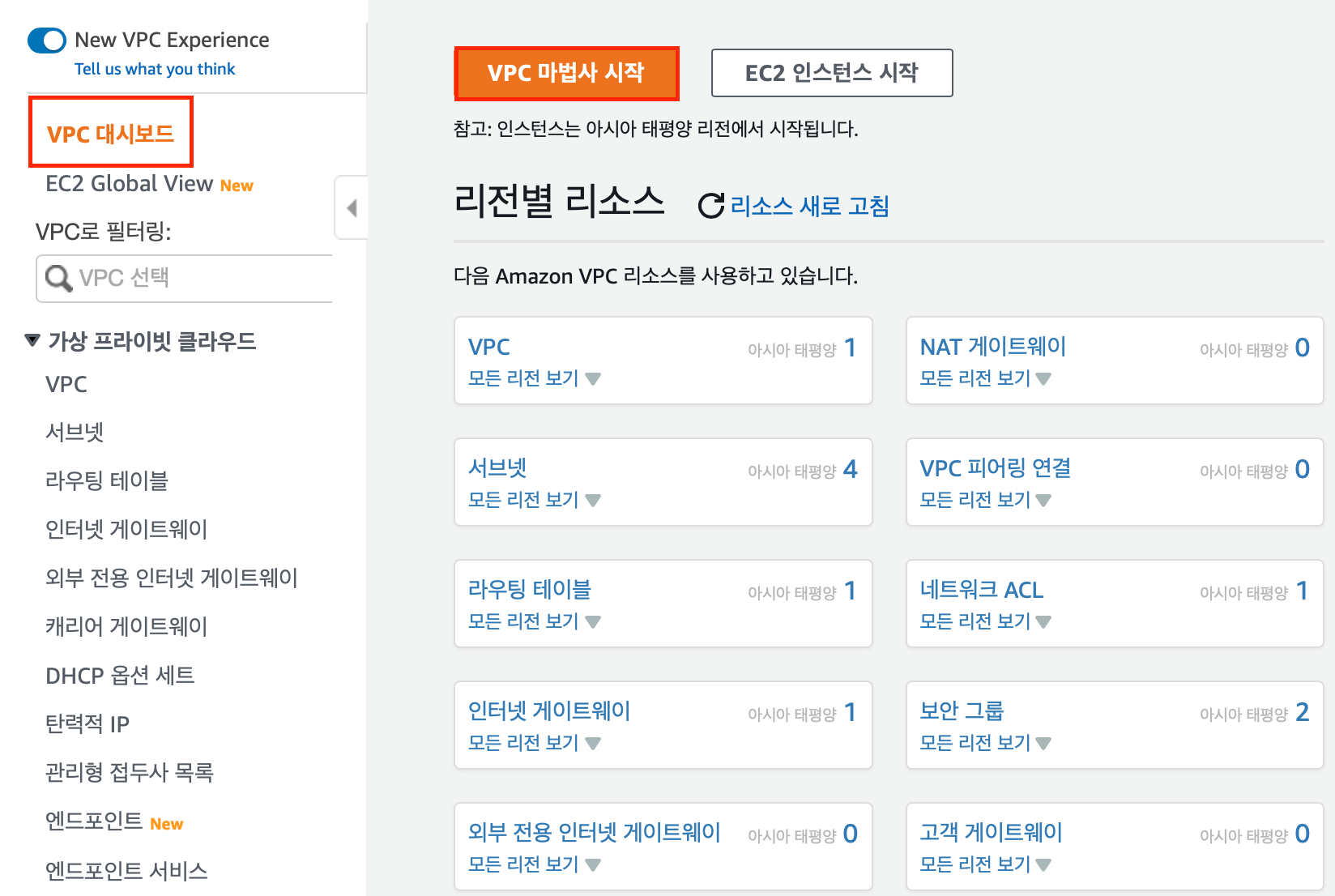 IP가 할당되면 VPC 대시보드로 가서 VPC 마법사 시작을 클릭