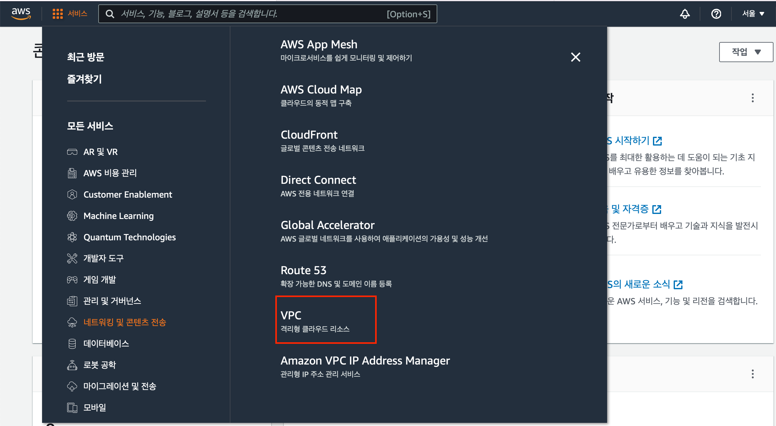 AWS 로그인 후 [서비스] - [네트워킹 및 콘텐츠 전송] - [VPC]로 이동한다.