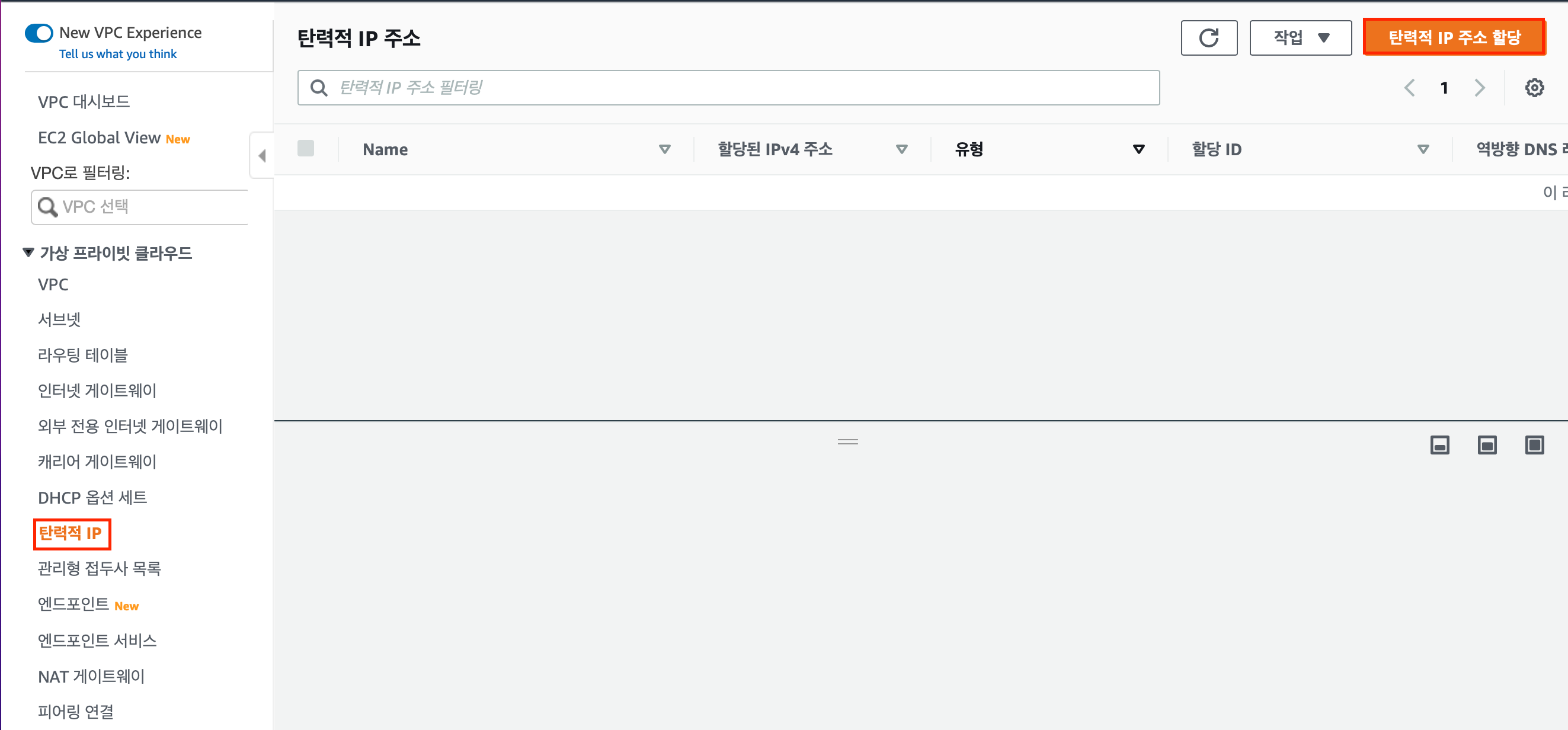 NAT 게이트웨이에 사용할 탄력적 IP 할당을 위해 [탄력적 IP] - [탄력적 IP 주소 할당] 을 클릭한다.