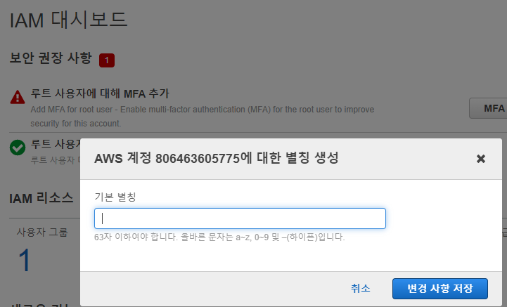 다시 ROOT 계정으로 접속 후 IAM 대시보드에서 IAM 계정에 대한 별칭을 바꿔야한다.