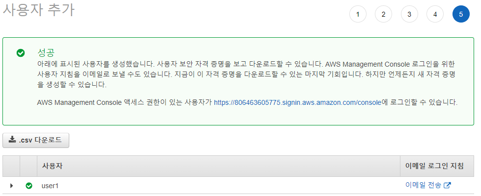 그룹까지 생성하면 사용자의 IAM 계정이 생성된다. 성공 후 링크를 통해 IAM 계정으로 로그인할 수 있다.