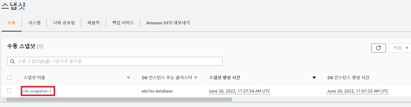 [RDS] - [스냅샷] 페이지로 가면, 생성된 스냅샷이 보인다.