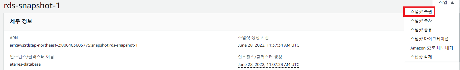 이제 해당 스냅샷으로 ate1es-database RDS 인스턴스에 존재했던, test_db를 복구할 것이다.