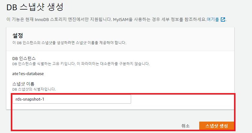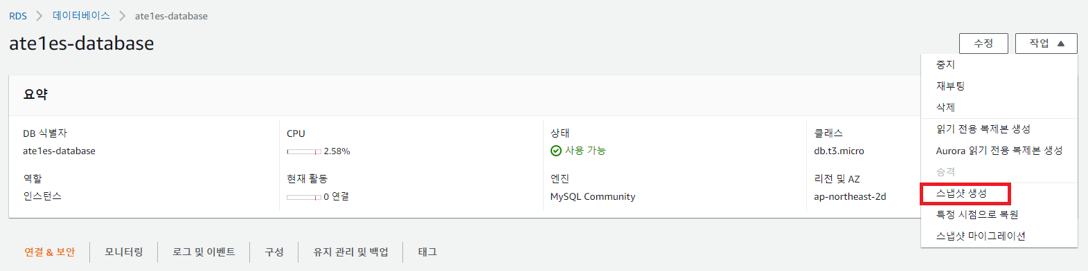 RDS 콘솔에서 스냅샷을 생성할 RDS 인스턴스 클릭후 [수정] - [스냅샷 생성] 클릭