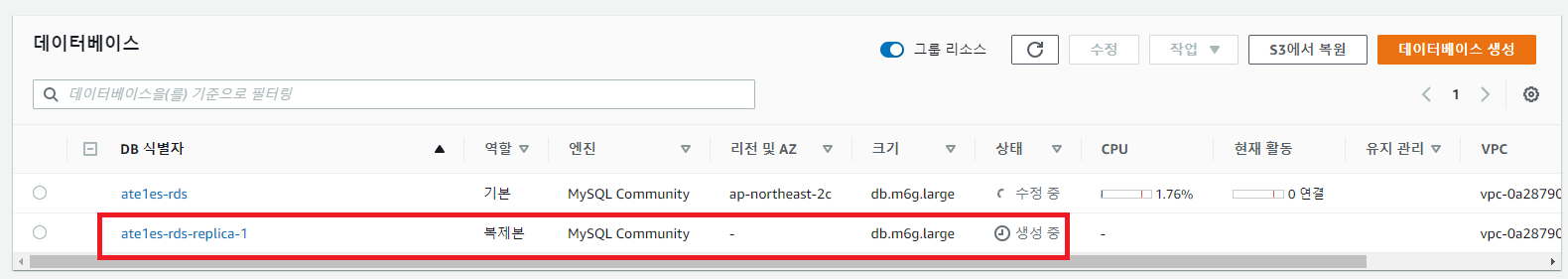 아래 사진과 같이 Read replica 가 생성완료 된 것을 확인할 수 있다.