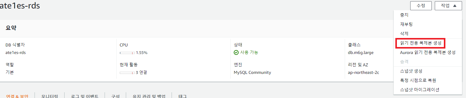 Read Replica 를 생성할 db 인스턴스에 접속 후, 읽기 전용 복제본(Read Replica) 생성 클릭