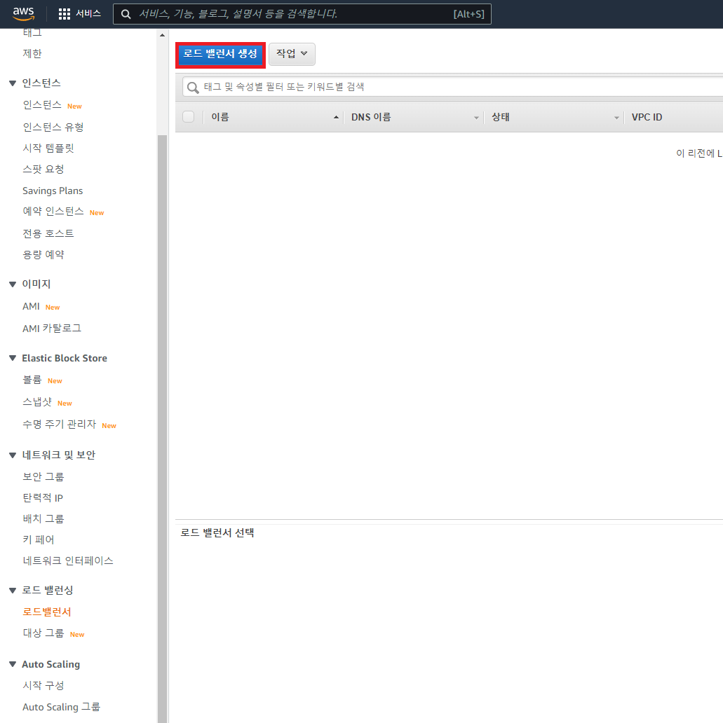1- EC2 콘솔의 로드밸런싱 메뉴에서 로드밸런서 생성 클릭