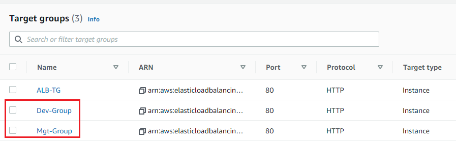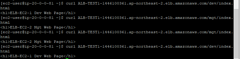 - 경로기반 라우팅 실습을 위해 각각 /dev , /mgt 밑의 index.html 생성