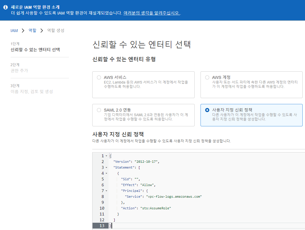 그 후 [사용자 지정 신뢰 정책] 클릭 후 아래와 같이 JSON 형식으로 정책 입력해줍니다.