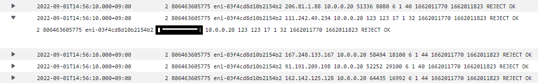 그 후에 CloudWatch logs 콘솔에서 로그를 확인하면, 내 IP로 접속을 시도하여 reject 당한 로그가 찍힙니다.
