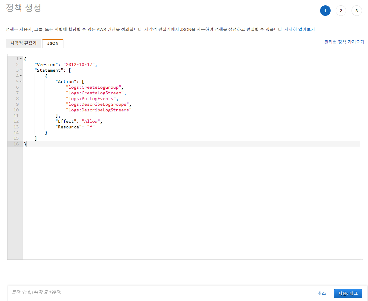 JSON 형식으로 해당 정책의 Action 을 정의해줍니다.