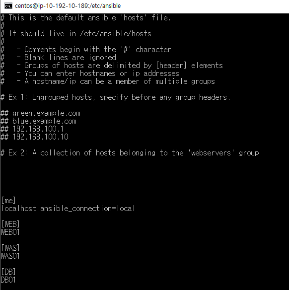 현재 나는 웹서버 1개, WAS 서버 1개, DB 서버 1개를 각각 [WEB], [WAS], [DB]라는 그룹에 넣어준것이다.