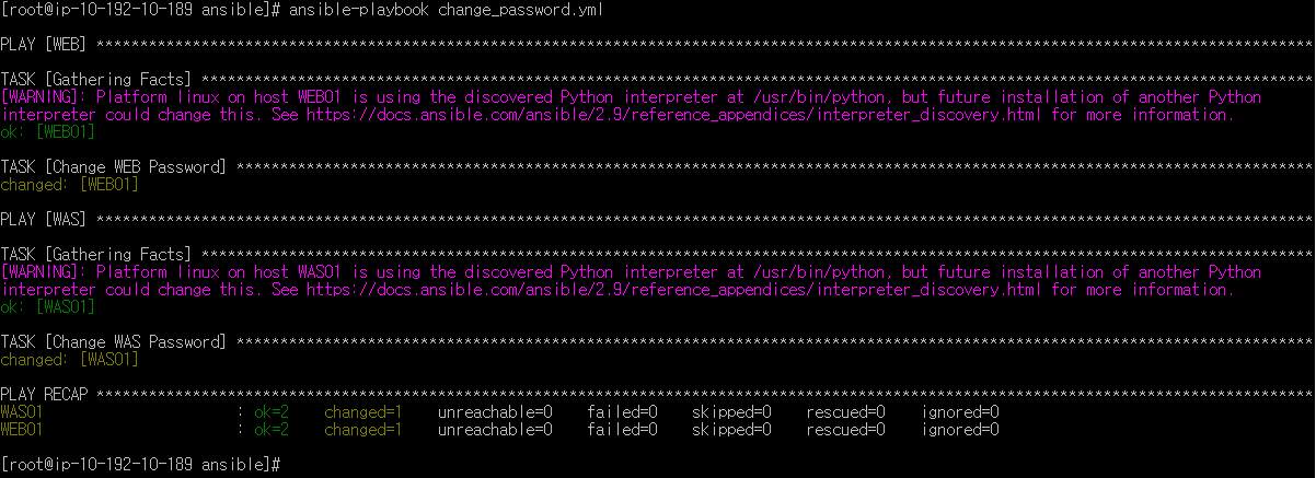 task 2번 - /etc/ansible/hosts 에 [WAS] 그룹에 존재하는 타깃 노드들의 root 유저의 password를 qwe321321로 변경