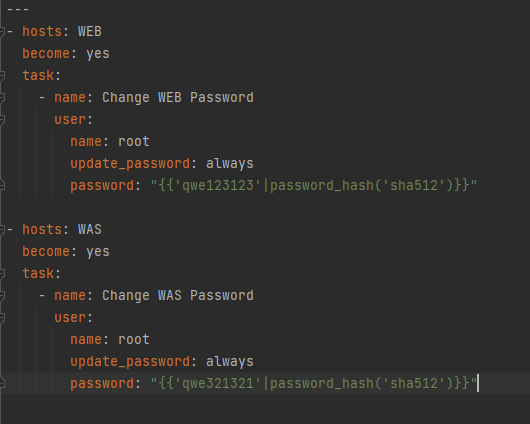 task 1번 - /etc/ansible/hosts 에 [WEB] 그룹에 존재하는 타깃 노드들의 root 유저의 password 를 qwe123123으로 변경