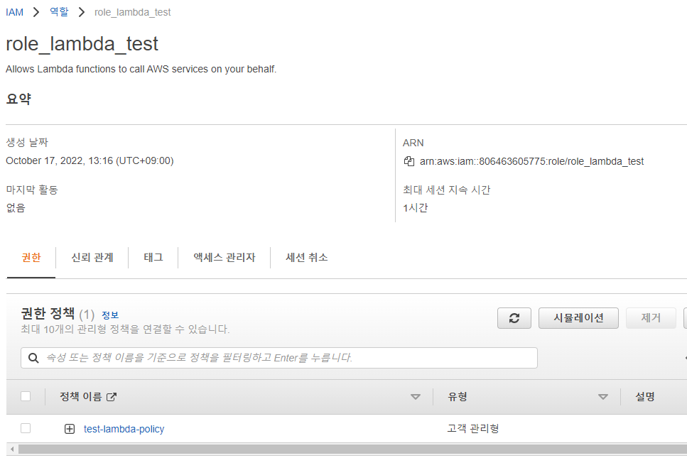 그 다음, Lambda 실행에 필요한 역할을 생성 후 위에서 만든 Policy 연결 해준다.