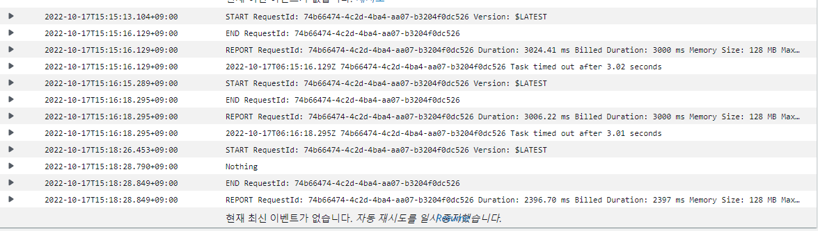 Cloudwatch Logs에 가보면, Lambda 함수가 생성한 로그 그룹이 있는데