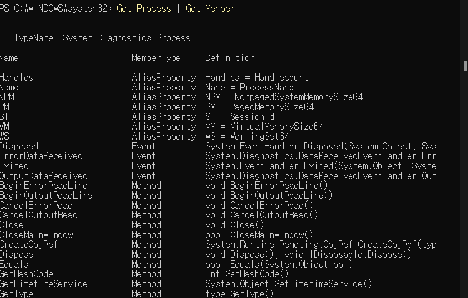 파워셸은 Get-Member 라는 명령어로 개체의 멤버를 볼 수 있다.