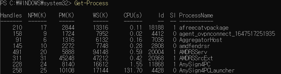 파워셸 명령어의 결과는 리눅스 명령 쉘과는 다른 구조를 가지고있다. 예를 들어 Get-Process와 같은 명령의 경우 아래와 같이 결과가 리턴되는데, 이는 컬렉션이라고 하는 개체(Object)들의 복수 데이터이다.